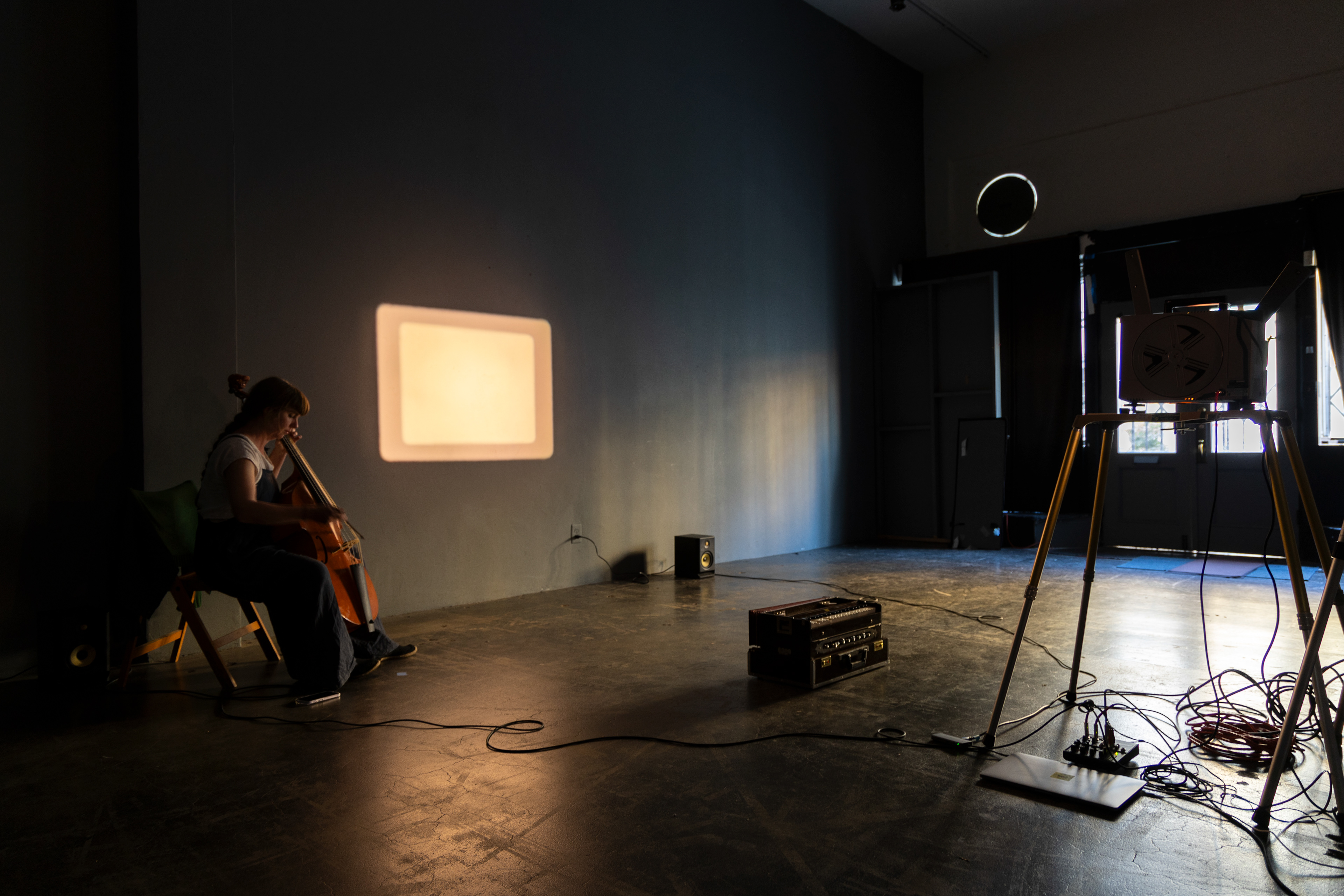 In Double Double or Nothing, a collaboration between Madison Brookshire and Laura Steenberge, two projectors, running without any film in them, each produce a low mechanical hum. A sine tone plays out of nearby speakers, creating a chord that quietly fills the room. Brookshire (harmonium and voice) and Steenberge (viola da gamba and voice) respond to this low chord with long tones tuned to the overtones to produce subtle textures that simultaneously feel ever-changing and invariable. —MB & LS