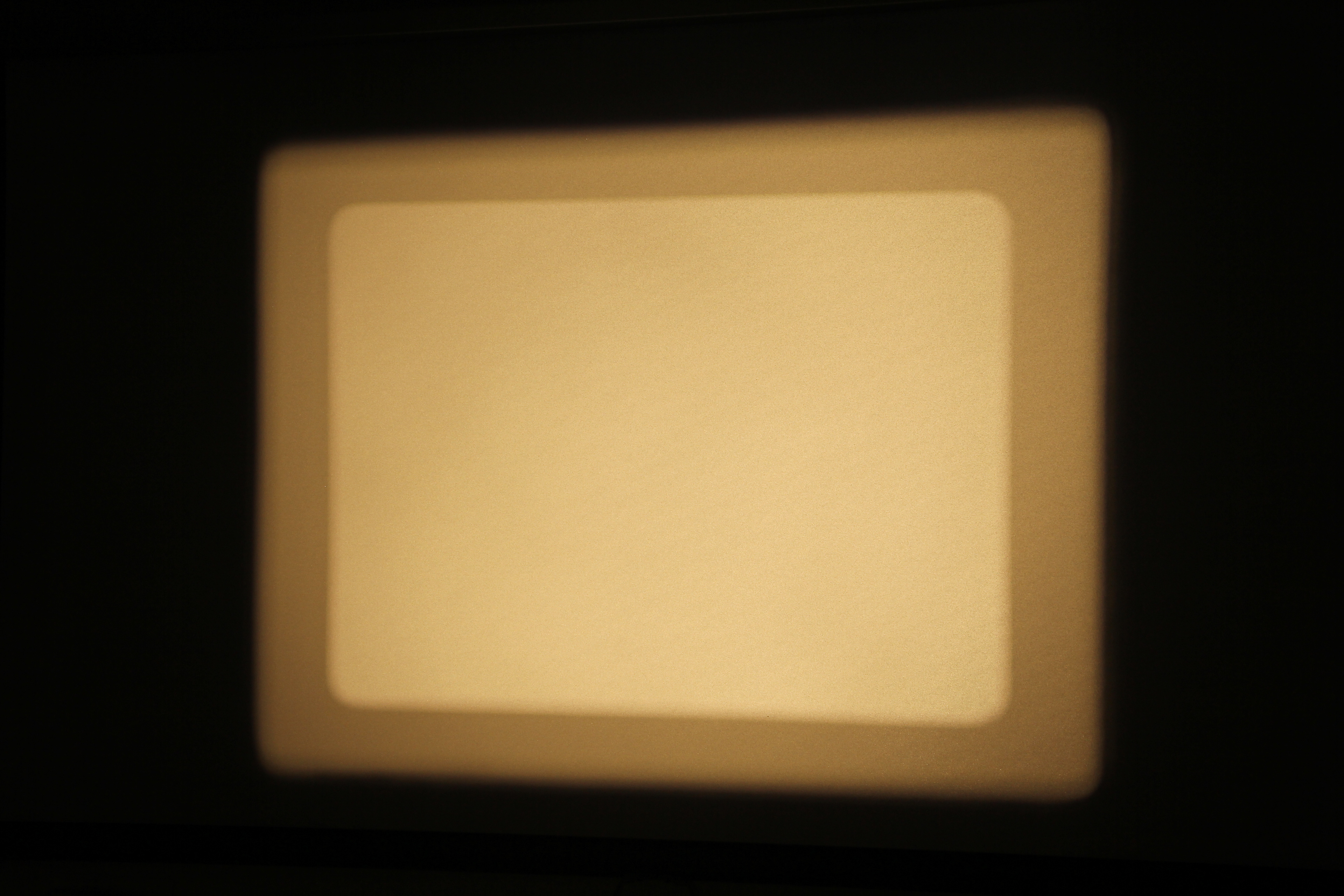 Offset 16mm projectors create an un-moving image: a field of light with a bright, inset rectangle. Sine tone, harmonium, and voice harmonize with and amplify the sound of the projectors.