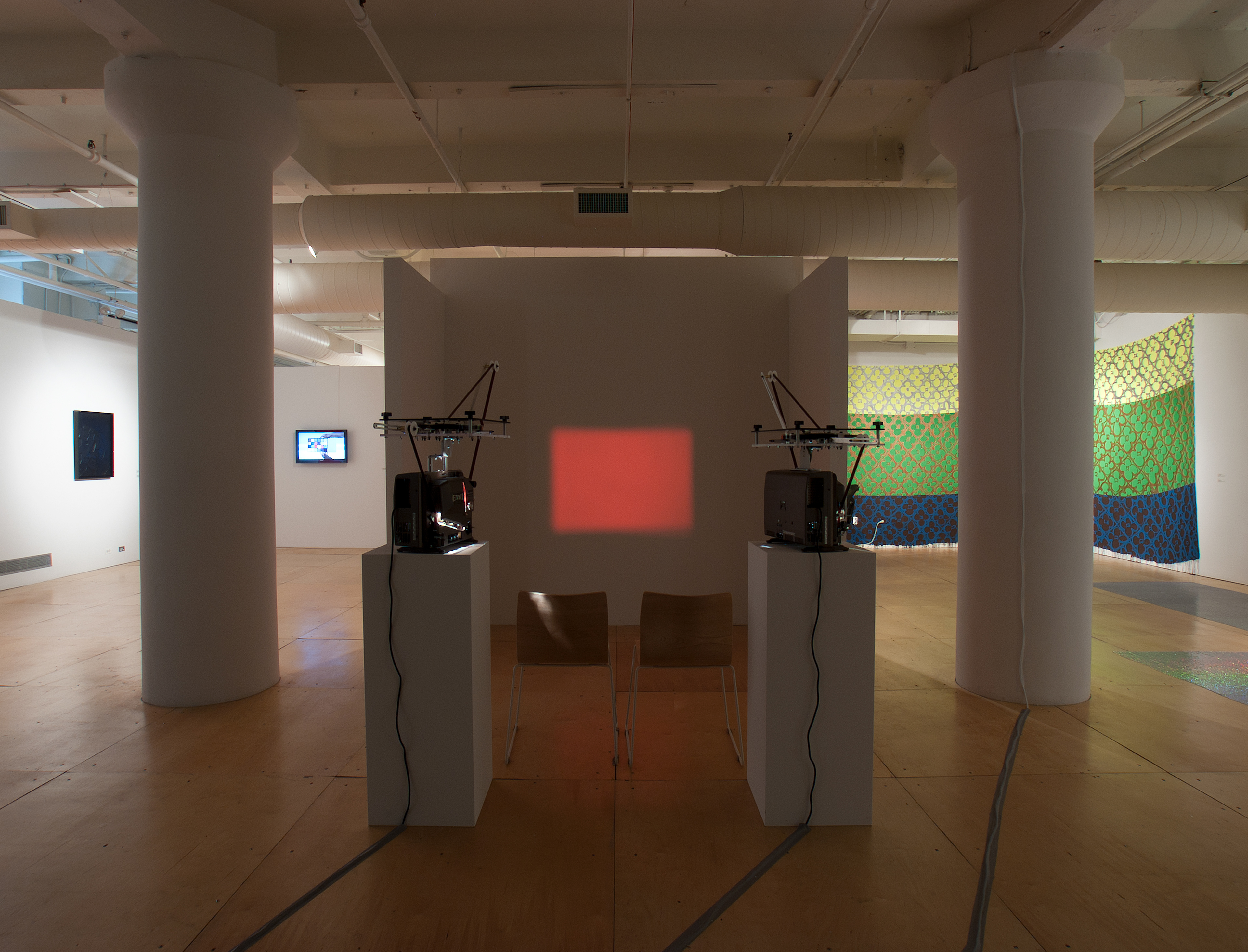 Symmetrical 16mm films overlap to produce colors, sounds and structures not found in either individual film. Over the course of 13 minutes, twin violin canons create an arc of sound, buzzing with dissonance, as a slowly shifting field of color evolves. The experience invites viewers to engage multiple modes of time and attention.