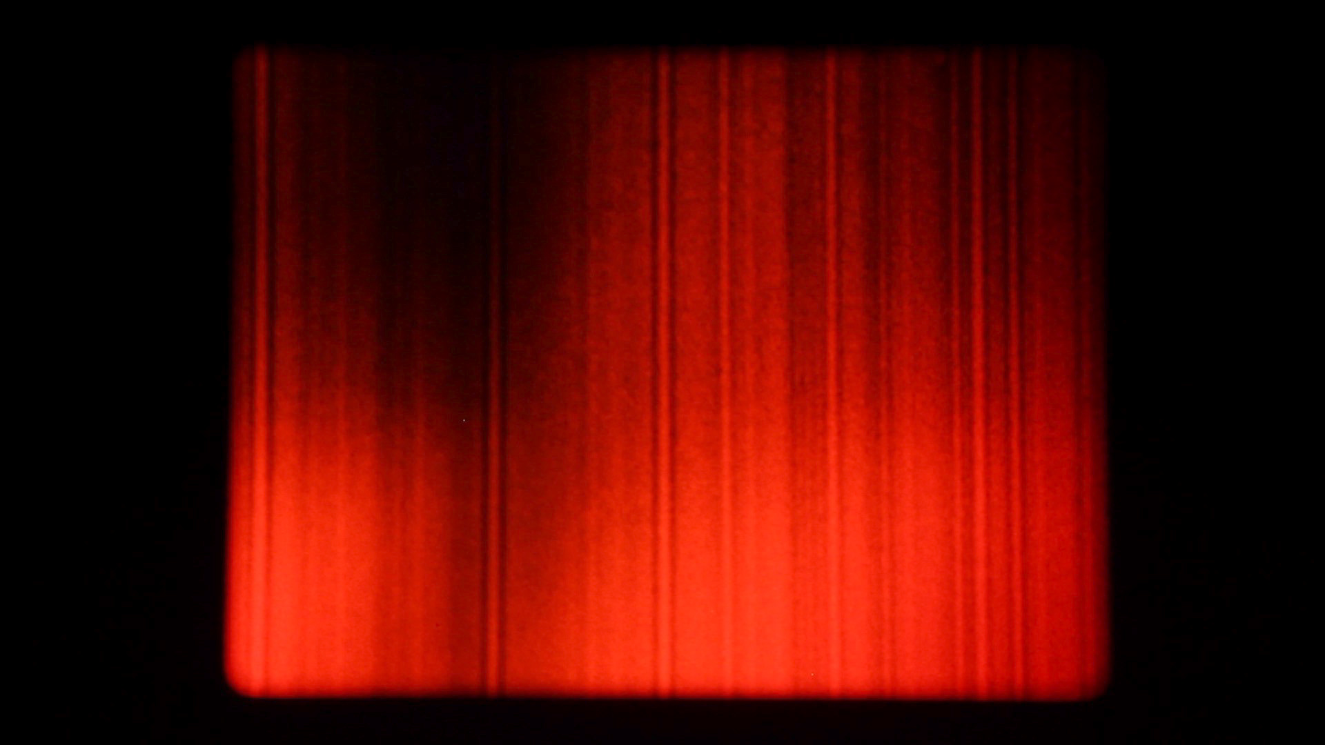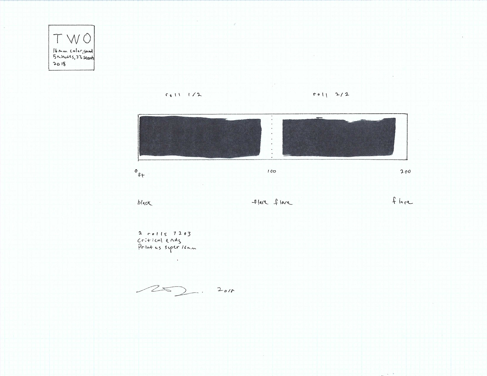 Made from two 100-foot rolls of 16mm film, exposed only when the film is loaded into and taken out of the camera, Two is mostly dark except for two flares that articulate the darkness. The color extends to the sounds track area of the film, producing a soft noise that changes slightly at the moments the film flares.