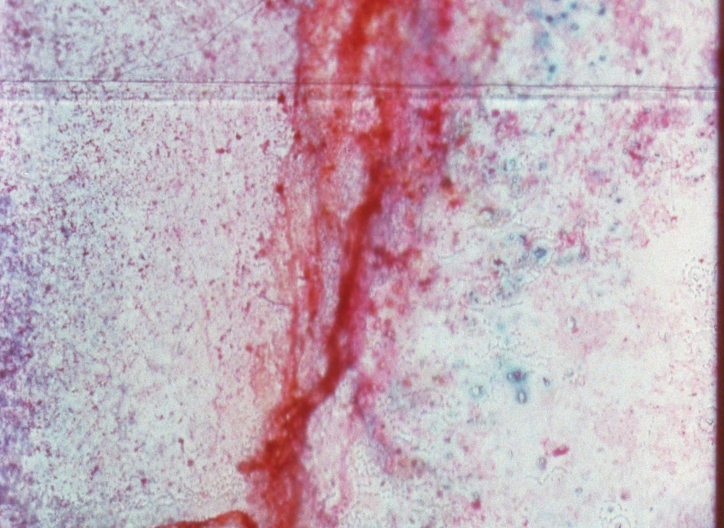 A hand-made, paint soaked film, allowing evaporation, dust, crystallization, mold, and more to inform the image. Stained with pigment and saturated with time, the result is a turbulent palimpsest with many layers and textures visible at once, each moving with its own rhythm. There is an affective quality to the excesses of the imagery that is both repetitive and ecstatic, yet the overall experience is quiet and reflective.